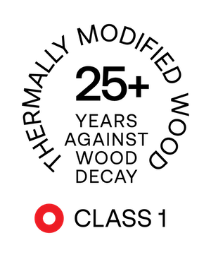 サーモパイン材の自然な外観は、節が特徴的な金褐色。 熱加工により、化学薬品を一切使用することなく、この針葉樹に数十年の耐腐朽性を持たせることができます。
