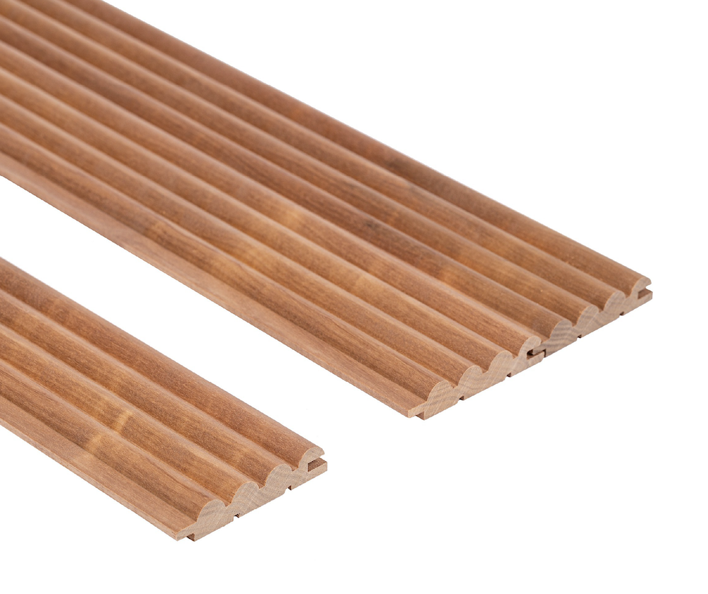 広葉樹(ヤナギ科)のアスペンをサーモ処理したサーモアスペンは、褐色で節のない見た目や、燻製させたような独特な香りが特長。フィンランドでは、その高い耐久性からサウナや外部の壁材・ベンチ材として使用される代表的な木材です。