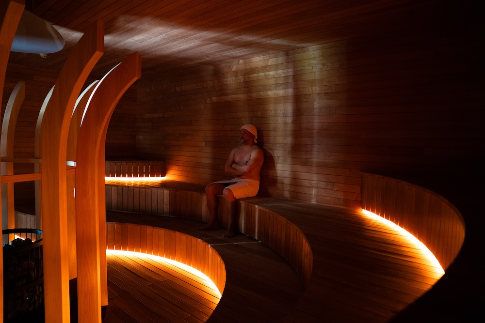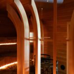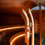 水墨画のように美しい瀬戸内海の多島美を臨む、瀬戸内温泉たまの湯。サウナ室のリニューアルに際し、サーモリーのサウナ用建材を採用しました。波打ち際をイメージした曲線のベンチに、照明や自然光を美しく映す壁。室内にはサーモリーのサーモウッドがふんだんに使われています。